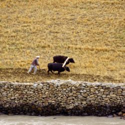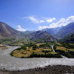 Am Ende dieses ereignisreichen Tages folgt noch eine dreistündige, recht ruppige Abfahrt, die nicht nur die Bremsen, sondern auch unsere Finger zum Glühen bringt. Ab Kalai Kumb rattern wir 240 km parallel an der Afghanischen Grenze entlang. Der reißende Panj Fluss bildet dabei die Grenze. Auf beiden Seiten hat es zahlreiche Dörfer, die uns im Gegensatz zur rauen Gebirgslandschaft, wie kleine Oasen erscheinen. In den Pausen beobachten wir die Bauern bei der Feldarbeit und genießen die Ruhe und den Anblick sehr. Die Menschen leben hier recht arm und sehr einfach, aber wunderschön und friedlich miteinander. Hin und wieder gibt es kleine Magazine, mal besser, mal schlechter sortiert. Dennoch gibt es Coca Cola oder Snickers, auch in den abgelegenen Dörfern dieser Region, ganz nach unserem Geschmack. Wir haben zudem immer eine Ration Kekse, Nudelsnacks und ´ne geräucherte Salami dabei, um dem Ganzen noch etwas Pfiff zu verpassen. Wasser ist kein Problem, davon gibt es hier reichlich für umme aus´m Filter.