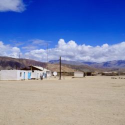 Bei Sonnenschein und leichtem Wind nehmen wir gegen Mittag den ersten Pass, bis dahin noch ein Kinderspiel. Nach dem Pass wendet sich aber das Blatt und das Fahren wird zunehmend zum Kraftakt. Wir kurbeln bei heftigen Gegenwind in ein Wüstental. Die Straße, die zuvor noch asphaltiert war, wird mehr und mehr zu einer Schotter- und Waschbrettstraße. Uns kommen immer wieder heftige Sandstürme entgegen, die ein Vorwärtskommen fast unmöglich machen. Mehrere Stunden kämpfen wir so gegen die Naturgewalten und kommen dabei kaum voran. Silvio ist schon völlig am Ende und hat kaum noch Kraft, zeitweise schieben wir nur. Aber wir müssen weiter, denn ein Campieren ohne Windschutz ist in diesem Tal kaum möglich. Völlig abgekämpft und erschöpft, finden wir dann gegen späten Nachmittag, kurz vor der Grenze, ein großes Erdloch. Dies ist die einzige Möglichkeit, um unser Zelt einigermaßen windgeschützt aufzuschlagen. Der Wind hier oben ist so kalt, dass wir kaum noch Lust haben uns draußen aufzuhalten. So fallen wir am Ende des Tages mit ein Stück Brot, einigen Keksen und den letzten abgeranzten Äpfeln ins Bett.