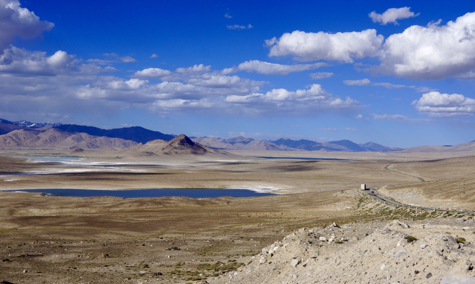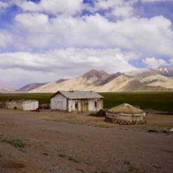 Die Sicht auf die noch höher liegenden Berge ist unbeschreiblich schön. Strahlend weiße Wolken liegen tief über unseren Köpfen und wechseln sich mit zum Teil heftigen Winden und der Sonne ab. So ergeben sich immer wieder schöne Schattenspiele und aller paar Minuten völlig neue Landschaftsbilder. Die Luft hier oben ist klar und sauber, aber dünn und Dominic plagen zunächst heftige Kopfschmerzen. So fahren wir wieder etwas runter und machen einen Abstecher nach Bulunkul, ein abgelegenes dreihundert Seelen Dorf mitten auf einem Hochplateau.