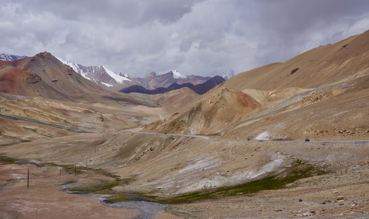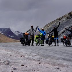 Der erste große Anstieg liegt nun vor uns, doch bevor wir den 3252 m hohen Khaburabot Pass in Angriff nehmen, geht es über eine improvisierte Holzbrücke. Wir müssen die Räder schieben, denn die Brücke ist recht schmal. Durch einen kleinen Fehler verfehlt Dominic mit einem Bein die Brücke und fällt in den reißenden Fluss. Glücklicherweise kann er sich so gut es geht an einem Steinbrocken festklammern und wieder herausziehen. Völlig schockiert sitzen wir am Rand des Flusses und müssen die Szene erstmal verarbeiten. Sein Rad stand noch an der Seite, sonst hätte die Reise wahrscheinlich hier ihr Ende genommen. Den 29. Juni werden wir nie vergessen und von jetzt an jährlich zelebrieren. Schnell noch die Klamotten gewechselt, schrauben wir uns mit drei, vier km/h zum Pass hinauf und treten dabei kräftig die Kurbel. Stellenweise müssen wir auch schieben und brauchen so für die 27 km samt Pause um die acht Stunden. Die Anstrengungen sind enorm, es ist heiß und Silvio hat zudem auch noch etwas Magenbrummeln. Dennoch schaffen wir den Pass an einem Tag und genießen oben die Aussicht auf die umliegenden Bergriesen.