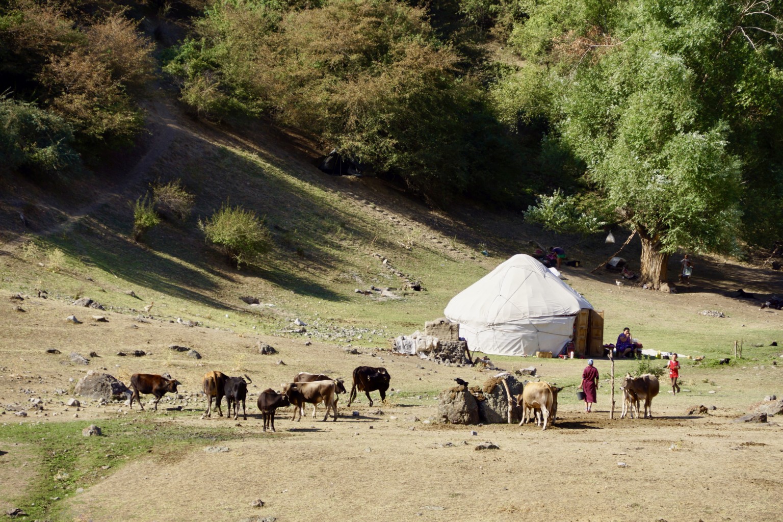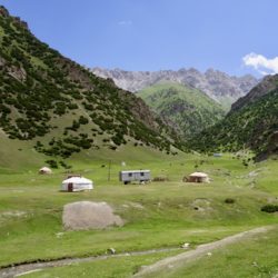 Eine anstrengende, aber auch sehr schöne Zeit im Pamirgebirge liegt nun hinter uns. Unsere Knochen liegen blank, wir sind müde und ausgepowert. Wir sehnen uns nach Ruhe, nach leckerem Fastfood und einer heißen Dusche. Doch bis zur nächstgrößeren Stadt ist es noch ein Stück und somit müssen wir uns noch etwas gedulden. Wir passieren die Tadschikische Grenze mitten auf einem Gebirgspass und rollen ca. 20 km abwärts durch ein Niemannsland bis zur kirgisischen Grenze. Dabei müssen wir vom Kyzyl-Art Pass immer noch gegen heftigen Wind kämpfen und unser Akkupegel steht bereits auf null. Es geht in ein weites grünes Tal hinunter nach Sary-Tash. Nach längerer Zeit im kargen und trockenen Hochgebirge hat es nun auf knapp über 3000 m wieder satte grüne Wiesen und ein paar Bäume. Nach und nach klettern die Temperaturen wieder in den oberen Bereich und die lange Klamotte landet tief im Gepäck. Auch die Straße hat es in sich, feinster Asphalt lässt unsere Rösser wieder wunderbar dahin rollen. Langsam geht es nun zurück in die Zivilisation. Im Tal verbreitet sehen wir die ersten Sommerweiden mit Pferden und die Jurten der Kirgisen. Hier leben die Menschen und Tiere im Einklang mit der Natur. Alles wirkt sehr friedlich und entspannt, wir fühlen uns sofort pudelwohl.