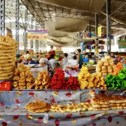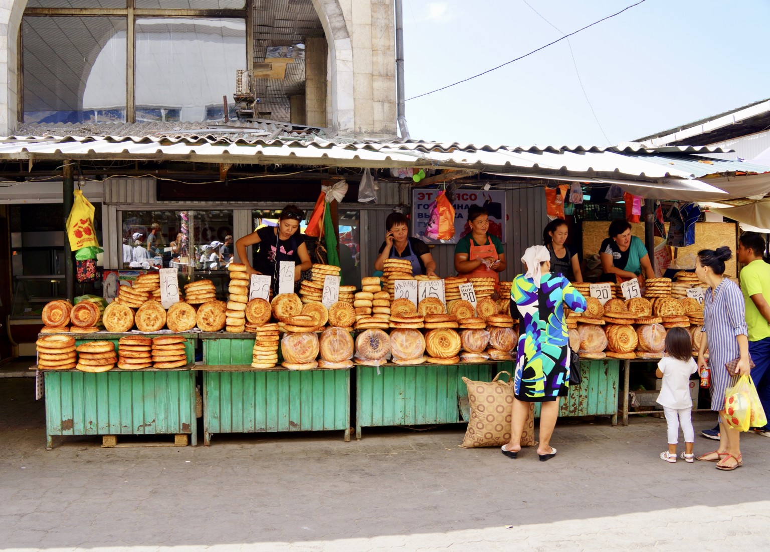 Die Stadt erreicht, nehmen wir zunächst unser angemietetes Apartment unter die Lupe. In den kommenden Tagen machen wir mal so richtig einen auf dicke Hose und wollen dort fünf grade sein lassen. Schniecke Küche, Badewanne, nen Sitzklo und nen großes Lümmelsofa… hach is das scheene. Der Supermarkt liegt direkt unten drunter und hat bis 3.00 Uhr morgens geöffnet, grandios. Die Regale sind reichlich gefüllt und stehen den europäischen Standards in nix nach. Wir decken uns mit allen Köstlichkeiten ein – ach ja, nen Kühlschrank haben wir auch – und machen anschließend noch einen Abstecher in die Burger-Bude. Beim Lesen der Speisekarte läuft uns bereits der Sabber aus dem Mund und wir freuen uns wie kleine Kinder auf das Menü. Den Kirgisen geht es vergleichsweise gut. Es gibt viele Einkaufsläden, Restaurants, sie fahren zum Teil recht große Autos, Internet gibt es fast überall und es ist so schnell, dass einem das Telefon aus der Hand flattert. In den letzten Wochen waren solche Dinge eher eine Seltenheit für uns. Um so mehr genießen wir jetzt diesen Luxus. In Osch selber machen wir nicht viel, außer dass wir den größten Basar Zentralasiens einen Besuch abstatten oder mit Harrie und Dianne ins China Restaurant gehen. Hier trennen sich dann auch unsere Wege, sie bleiben noch ein paar Tage länger und wir machen alleine weiter.