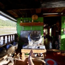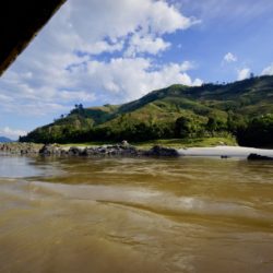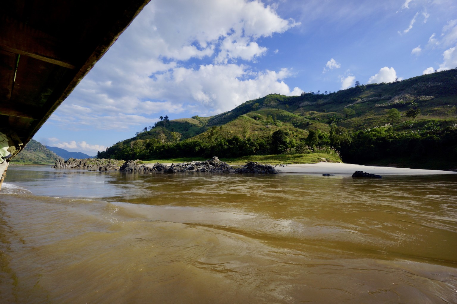 Sabaidee, Sabaidee…, das sind die Worte, mit denen man hier in jeder Ortschaft von leuchtend großen Kinderaugen, winkend und mit grinsendem Gesicht in Empfang genommen wird. Nach mittlerweile knapp einem Jahr auf dem Sattel (kaum zu glauben), haben wir die Mitte Südostasiens und somit Laos erreicht. Vom äußersten Nordwesten her, bekannt auch als das „goldene Dreieck“, passieren wir die Grenze. Doof nur, dass wir nicht radeln dürfen und stattdessen auf den Bus umsatteln müssen, um über den Mekong (der den Grenzfluss bildet) zukommen. Aber alles EASY GOING, kein Problem und zack sind wir in Ban Houayxay, dem Grenzort auf laotischer Seite. Hier besorgen wir uns kurzerhand ein Bootsticket, denn wir wollen entspannt ankommen und schippern statt radeln zwei schöne Tage lang mit einem Slowboat den Mekong flussabwärts. Die Landschaft ist abwechslungsreich mit vielen Bergen, Felsformaionen, Sanddünen und hin und wieder kommen erste kleine Dörfer zum Vorschein. Auf dem Boot haben wir viel Zeit, lernen nette Leute kennen, haben Spaß und genießen diese doch so außergewöhnliche Flussfahrt.