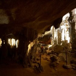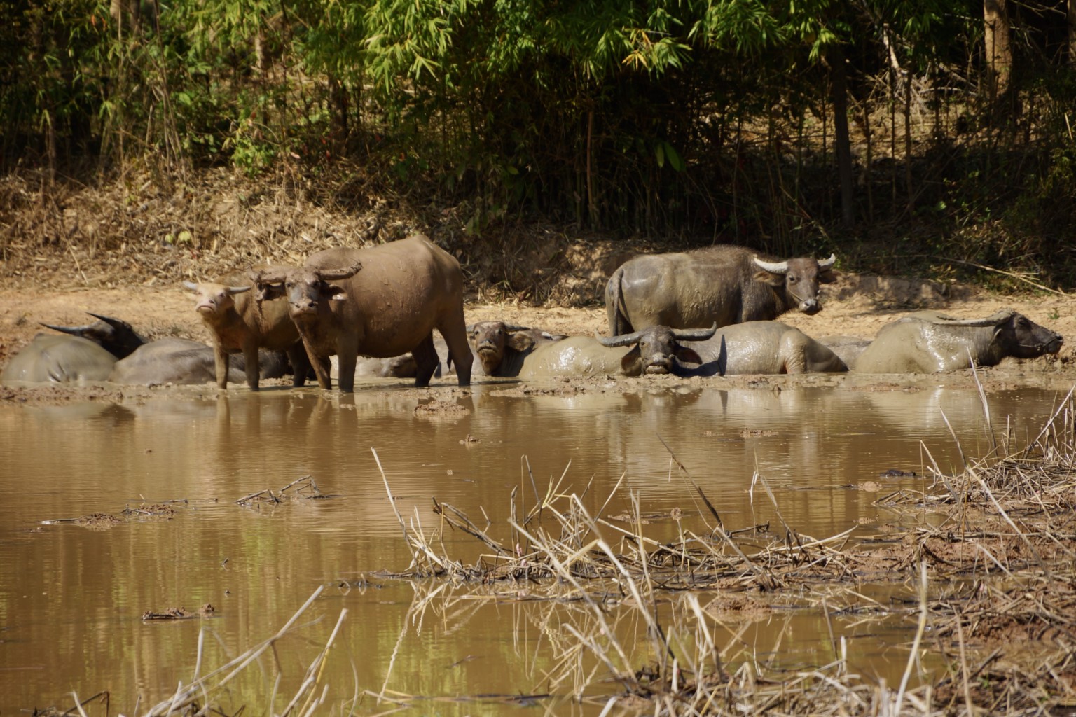 Die eigentliche Hauptattraktion dieses ruhigen Ortes ist aber die 7,5 km große Tham Kong Lo Höhle und so machen wir einen zweistündigen Longtail-Bootstrip durch diese riesige und dunkle Kalksteinhöhle. Nach einer Verschnaufpause radeln wir wieder zurück auf den Loop. Wir haben den letzten Tag unseres ersten Jahres und stehen kurz vorm Ende des Arbeitstages, als wir am Straßenrand ein unscheinbares Schild entdecken auf dem „Cool Pool“ geschrieben steht. Die 4 km Umweg nehmen wir natürlich gerne in Kauf, fahren durch ein letztes kleines Dorf an Wasserbüffeln und einer Herde Rindern vorbei und gelangen über staubiger Piste zu einem Karstberg. Am Rande dessen befindet sich ein glasklarer Naturpool mit einem anliegenden Holzsteg. Als wir diese kleine Perle entdecken, sind wir völlig aus dem Häuschen und beschließen hier zu übernachten. Wir sind allein und es ist so ruhig, dass wir einzig die Fische durch das Wasser plätschern hören, fantastisch. Was folgt, ist eine perfekte Nacht unter freien Vollmondhimmel. Leider erleben wir in diesen Tagen eine kleine Kälteperiode (um die 20 °C), so dass der Sprung ins kühle Nass leider ausbleibt.