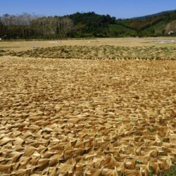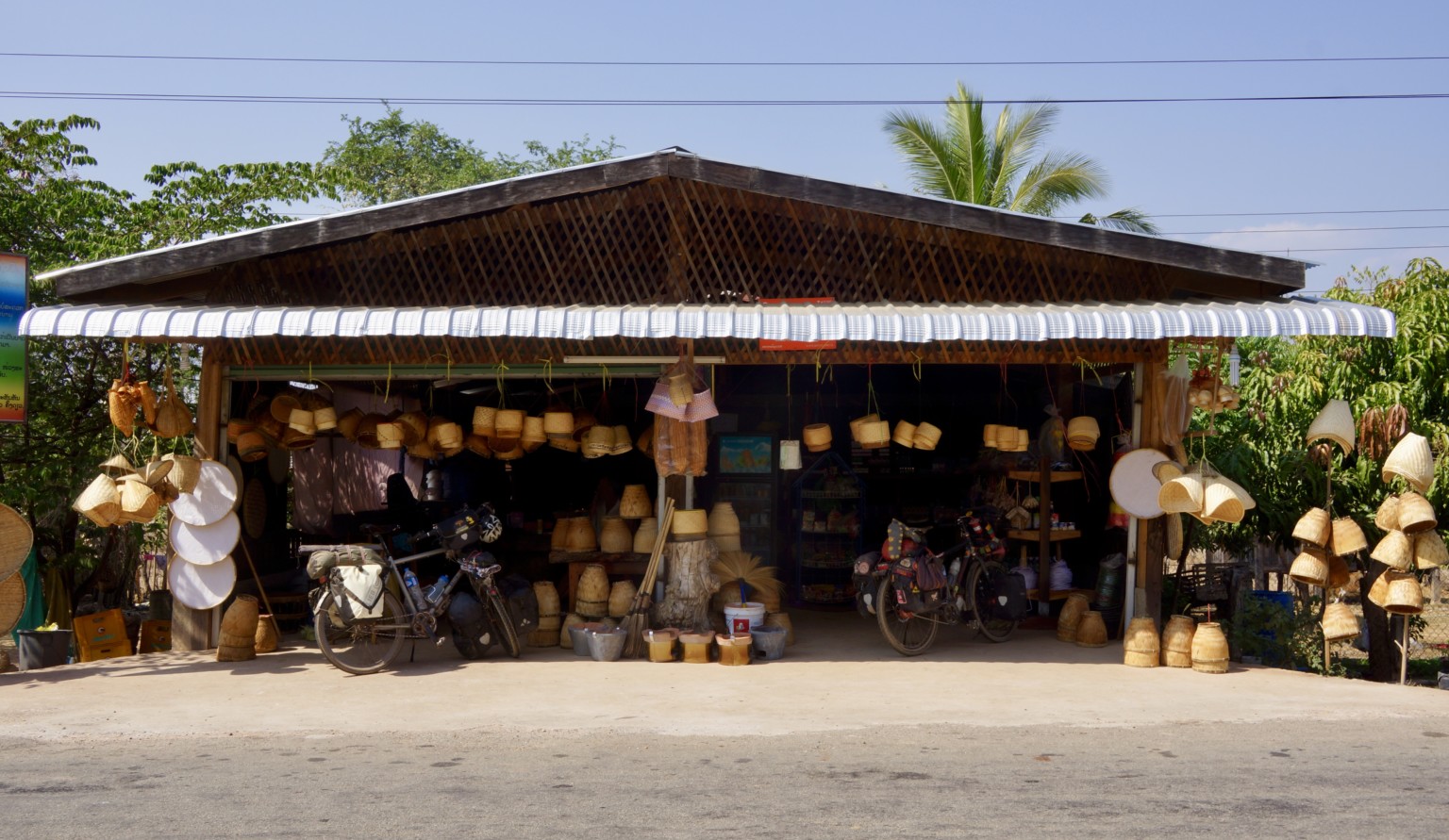 In Vieng Kham machen wir einen Abbieger auf die Straße 8 und starten von hier aus einen mehrtägigen Loop durch Zentrallaos. Triefend schleppen wir uns dabei einen (zwar recht kurzen aber zähen) Anstieg hinauf zu einem Aussichtspunkt und blicken auf die schwarzen Karstberge der Umgebung, deren Spitzen aussehen wie scharfkantige Sägeblätter. Was folgt, ist eine tolle Abfahrt in eine Tiefebene, welche eben von solchen bizarren Bergen umgeben ist. Wir nehmen einen weiteren Abzweig und fahren 40 km auf einsamer und ruhiger Straße durch kleine Dörfer und an unzähligen Tabakfeldern entlang. Auch hier leben die Menschen recht dürftig, aber genügsam in ihren Holz- oder Bambusverschlägen. Konglor ist unser Ziel, ein kleines Dorf am Ende dieser Landstraße. Wir finden Unterschlupf in einem schlichten Holzhaus einer Gastfamilie, die außerdem ein kleines Café am danebenliegenden Fluss betreibt. Ein tolles grünes Idyll, welches uns zum Verweilen einlädt. Auch wenn der Ort ganz schön angepriesen wird, erleben wir hier ein laotisch dahinfließendes Dorfleben. Wir sitzen inmitten von Gänsen, Hühnern, es gibt Schweine und eine Menge Hunde die durchs Dorf tingeln. Einige Frauen stellen Stoffe an ihren Webstühlen her (Laos ist bekannt für seine Webkunst), meist sind es Schals, Tücher, Decken oder Wickelröcke mit tollen Mustern, die die Frauen hier überall tragen. Unsere Gastgeber wiederum hocken zusammen und kümmern sich um ihre Tabakernte. Dabei werden die einzelnen Blätter nach und nach aufgefädelt und dann für mehrere Tage in einem Speicherhaus getrocknet.