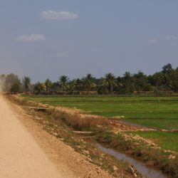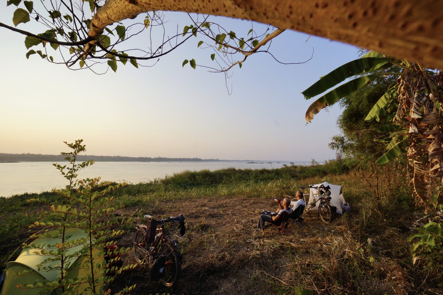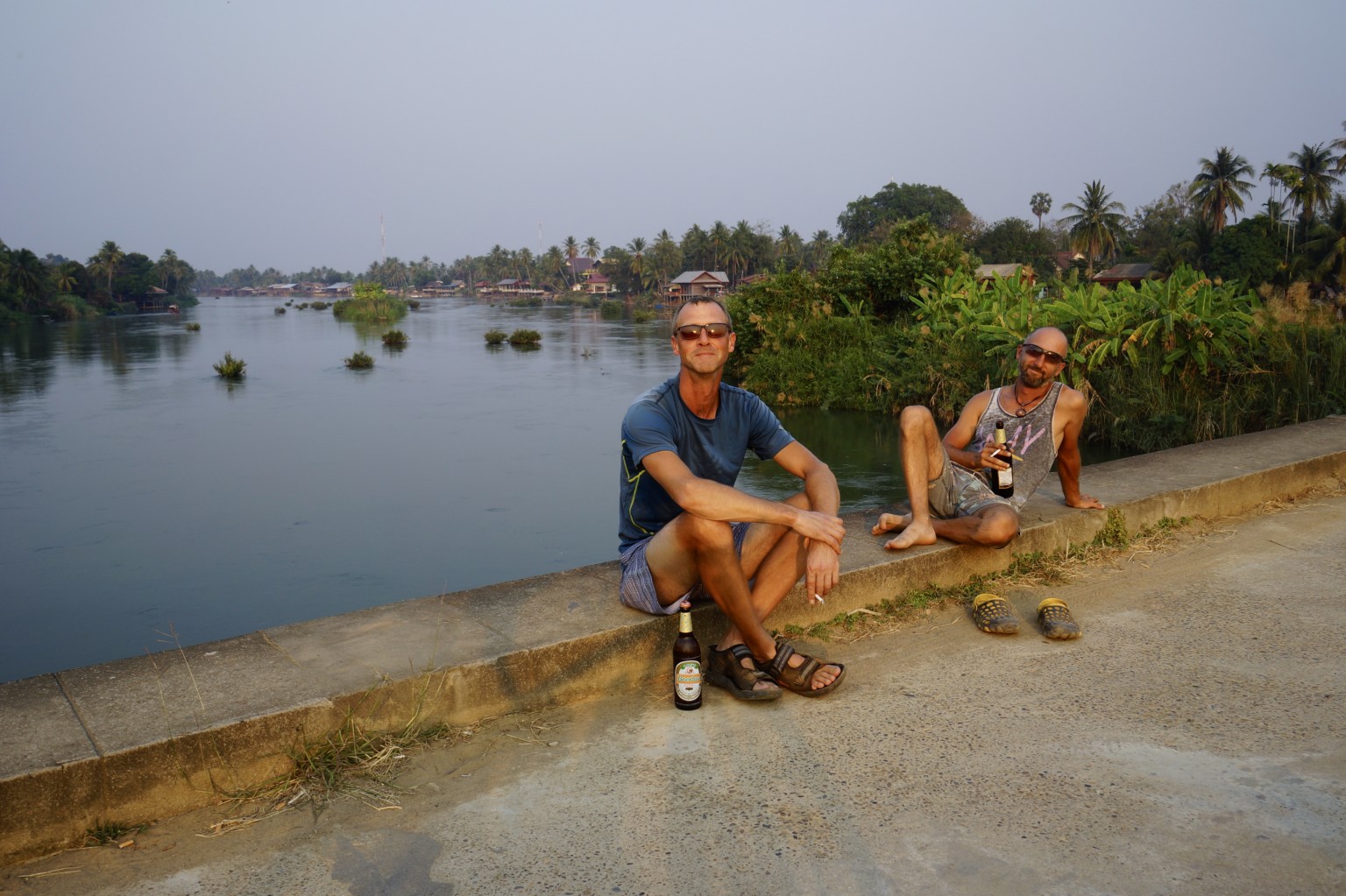 Der Weg führt uns weiter nach Attapeu und wir streifen dabei die östliche Seite des Bolaven Plateaus. Es geht durch ein Kaffeeanbaugebiet und wir sehen zum ersten Mal, wie die Bohnen wachsen und getrocknet werden. Ab Attapeu folgen wir der „neuen“ A18, einer 110 km langen Schotter-und Staubpiste. Vor vielen Jahren war dies wohl noch ein Dschungelpfad, doch leider wurde eine breite Schneise durch die laotische Pflanzenwelt gezogen. Trotz all dem macht die Fahrt Spaß. Die Straße ist recht einsam, wir über- und durchqueren einige Flüsse, was für etwas Abkühlung und Abwechslung sorgt. Unseren Abschluss durch Laos runden wir mit einem Abstecher auf Si Phan Don (den 4000 Inseln) ab. Bei leuchtend roten Sonnenuntergang trudeln wir auf der Insel Don Loppadi ein, radeln durch kleine Fischerdörfer und haben einen ersten Blick auf die vielen grünen Inseln die sich aus dem Wasser erheben.