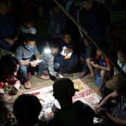 Am Abend gibt es im Nachbardorf ein Fest zu Ehren eines Wasserbüffels, der seine letzten Stunden erlebt und wohl am nächsten Morgen sein Leben lassen muss, der Arme. Es gibt eine Bühne mit Live Musik, eine Saftflaschen- und Luftballonschießbude und Straßenspieler die mit ihrem Stand zum Glücksspiel auffordern (ähnlich wie „wo ist Kugel, wo ist Ball“) kurz nach der Wende. Ein richtiges Dorffest eben. Wenig später werden wir in ein Haus gebeten und zu einem typisch laotischen sticky rice (Khao Niew) Essen eingeladen. Der Klebreis wird dabei meist lauwarm und in Korbbehältern serviert. Man formt ihn zu kleinen Bällchen und tunkt ihn in diverse scharfe Saucen die z.B. aus Chili oder Ingwer bestehen, dazu wird Salat, frische Minzblätter und etwas Fleisch gereicht. Schade das wir zuvor unseren Magen vollgeschlagen haben und so bleibt es dankender Weise nur bei einer kleinen Kostprobe.