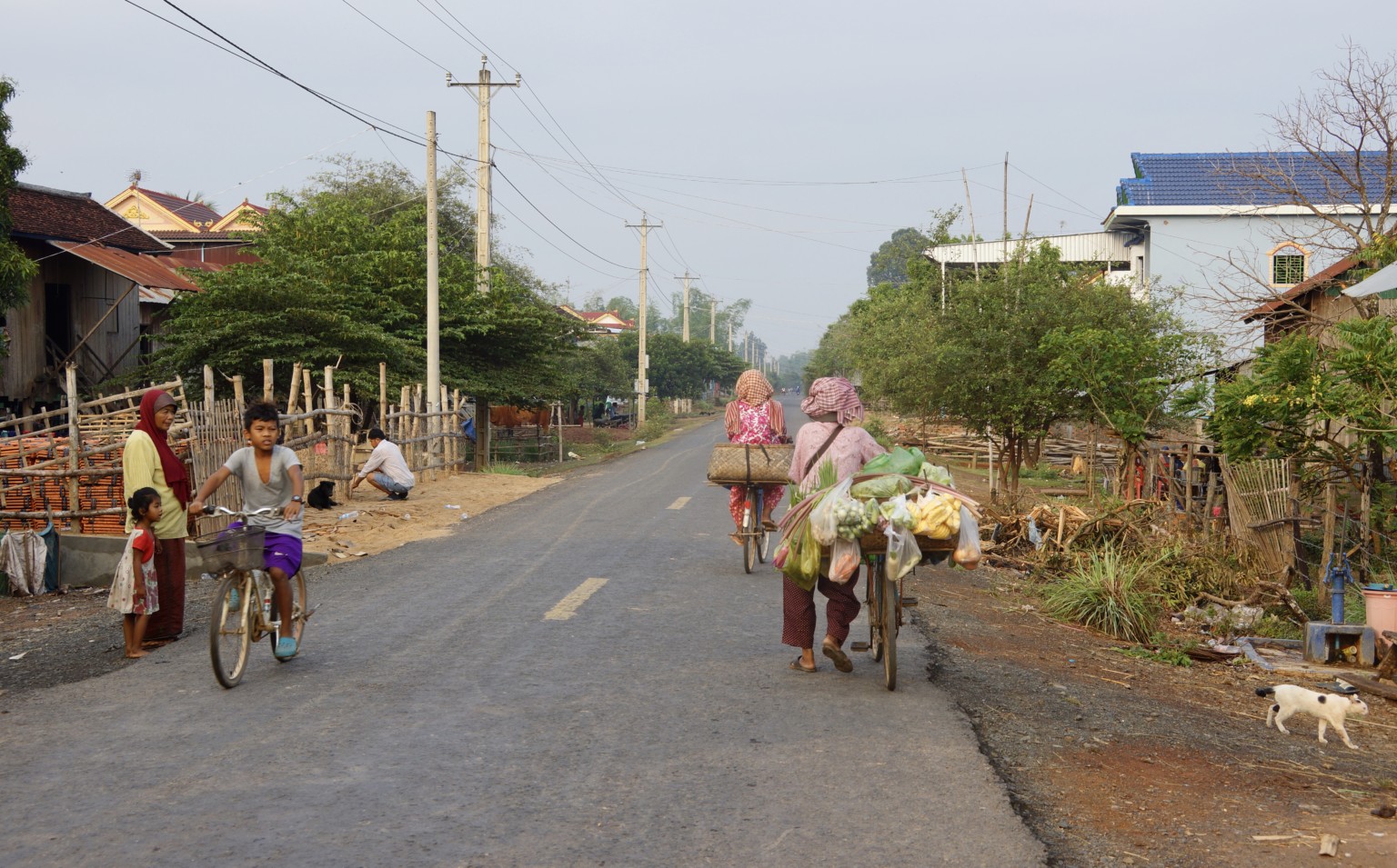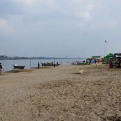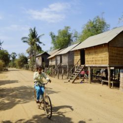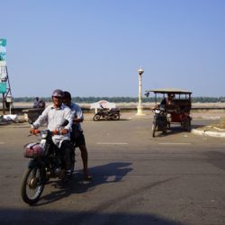 Doch an diesem Tag ist das Glück auf unserer Seite und kurz vor Sonnenuntergang finden wir einen Strand an einem kleinen Wasserfall mit Badestelle. Es ist nur ein Einheimischer da, der sein Moped im Mekong putzt. Da der örtliche Laden im letzten Dorf, winke winke – bye bye, nicht viel zu bieten hat, sind wir mutig und essen gekochte Eier die schon den halben Tag in der Sonne lagen. Aber alles gut, die Verdauung spielt mit. Wir bauen die Zelte, bzw. die Moskitonetze auf und gehen erstmal baden. Das Wasser ist warm und sauber. Wir stehen früh auf, um der größten Hitze zu entgehen und radeln am Mekongufer nach Kratie. Zuerst auf Sandwegen durch winzige Dörfer, winke winke – hello hello, in denen nur Bambus- und Bretterbuden auf Pfählen stehen, später schon auf Asphalt durch „moderne“ kleine Ortschaften. In Kratie suchen wir die französische Architektur vergeblich, finden aber dafür ein günstiges Hotel mit Klimaanlage, direkt am großen Fluss. Wir bleiben zwei Nächte und lassen die ersten Eindrücke von Kambodscha nachwirken. So richtig haut uns das Land nicht vom Sattel, aber das kann ja noch kommen.