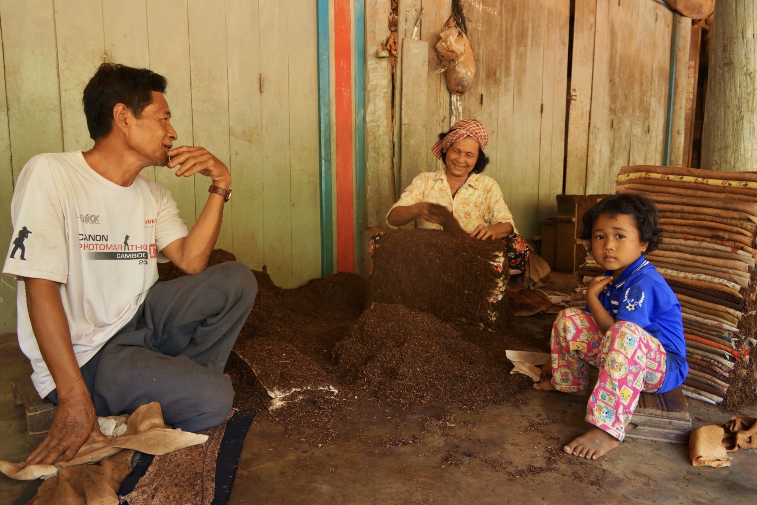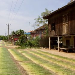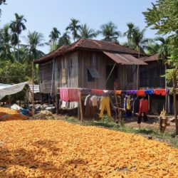 Noch haben wir über zweihundert Kilometer bis nach Phnom Penh vor uns, also ist frühes Aufstehen angesagt. Bis zur Hauptstadt ist es im Grunde genommen ein einziges lang gezogenes Dorf, winke winke – bye bye. Alles ist besiedelt und bebaut. Doch jetzt gefällt es uns. Es ist wieder schön grün, die Straßen sind vernünftig und die Pfahlhäuser sehen nicht mehr ganz so armselig aus. Jedes Haus hat einen Garten, mit Bananen, Kokospalmen und Mangobäumen. Davor trocknen Reis, Maiskolben und anderes Gemüse in der Sonne. Hier gibt es auch die großen weißen Ochsen, die wir schon aus Thailand kennen. Es gibt wieder jede Menge an Läden in denen wir eine Pause mit Coca Cola einlegen und kleine Restaurants für die Mittagspause. Unterwegs kommen wir nach „Tabakhausen“, winke winke – hello hello, so nennen wir den Ort, weil hier und in der ganzen Region nicht nur Tabak angebaut, sondern auch getrocknet und weiterverarbeitet wird. Frauen sitzen unter Dächern und legen den getrockneten Tabak auf Tücher, welche dann gepresst werden. Wir bekommen auch eine Kostprobe, drehen uns ein Kippchen, doch das Zeug ist so stark, dass wir sogar eine Handvoll davon als Geschenk ablehnen müssen. Im Raum nebenan liegt noch ein ganzer Berg davon. Eine Schachtel Zigaretten kostet in Kambodscha umgerechnet zwanzig Cent. Was bekommen wohl die Frauen für ihre Arbeit?
