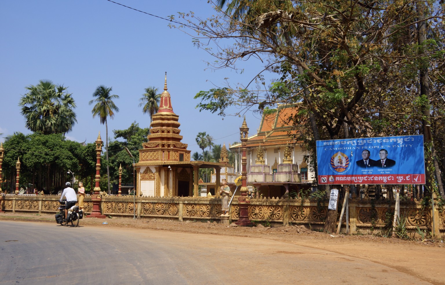 Große und imposante Tempel zieren die Dörfer, winke winke – bye bye, wir bestaunen sie allerdings nur von außen. Wir waren schon in zu vielen. Mönche laufen in Gruppen über die Dorfstraße und werden von den einheimischen mit Essen versorgt. Dafür bedanken sie sich mit einem Segen beim Spender. Viele der Tempel sind neu und ähneln sich. In der Zeit der Roten Khmer wurden fast dreitausend von ihnen zerstört und die Mönche umgebracht. Jetzt ist die Religion wieder fester Bestandteil des Lebens der Menschen. In Kampong Cham müssen wir auf die andere Seite des Mekong. Wir bleiben eine Nacht im Hotel Mekong und fühlen uns fast wie in Thailand. Viele Fressstände, eine schöne und saubere Uferpromenade mit Denkmälern und vielen bunten Lichtern am Abend. Es herrscht eine entspannte Atmosphäre, die Kambodschaner schlendern herum, essen Eis und machen Sport. Wir müssen trotzdem früh raus, denn mittags ist es unerträglich warm. Das Ufer sehen wir selten, denn alles ist bebaut. Eigentlich wollten wir zelten, doch jeder freie Fleck wird genutzt und für eine ewige Sucherei nach einem schönen Platz fehlt uns die Lust. So bleibt uns nichts anderes übrig, als uns in kleinen Gästehäusern einzuquartieren. Diese haben eine Klimaanlage, das macht das Ganze sehr angenehm. Die Ausstattung ist manchmal recht ungewöhnlich. Es gibt eine Klimaanlage, einen Fernseher, soweit, so gut. Im Bad gibt es Seife, ein Glas, Zahnbürsten und einen Kamm. Das verwirrt uns etwas, doch es liegt wohl daran, dass die Kambodschaner die Haare schön haben wollen.
