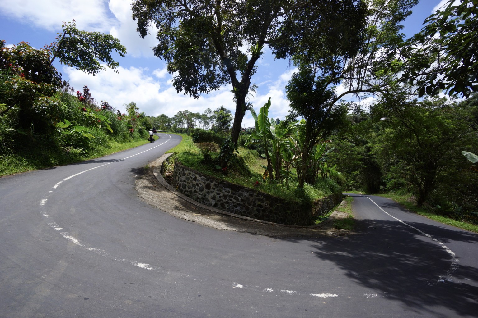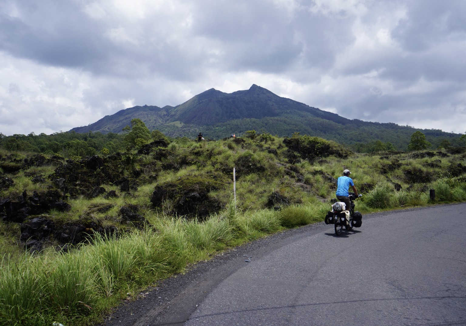 Als wir nach einer gefühlten Ewigkeit auf dem Kraterrand stehen, ist das ein fantastischer Anblick. Im Krater ist ein See, Felder, Wälder und kleine Siedlungen. An seinem Rand hängen große weiße Wolken, die Schatten auf die Landschaft werfen. Dann geht es für uns so steil runter wie es hochgegangen ist. Eine Unterkunft mit einer heißen Quelle ist schnell gefunden. Wir liegen im warmen Wasser und schauen direkt auf den Vulkan Batur, an dessen Flanken noch die Spuren vom letzten Ausbruch zu sehen sind. Da wir keine Lust haben den steilen Kraterrand wieder hochzufahren, fragen wir den Besitzer nach einer Transportmöglichkeit. Und wir haben Glück, hieven am anderen Morgen die Räder auf einen LKW und lassen uns ein Stück mitnehmen. Bezahlen müssen wir nichts. Terimah Kasi(Danke). Sama Sama(Bitte).