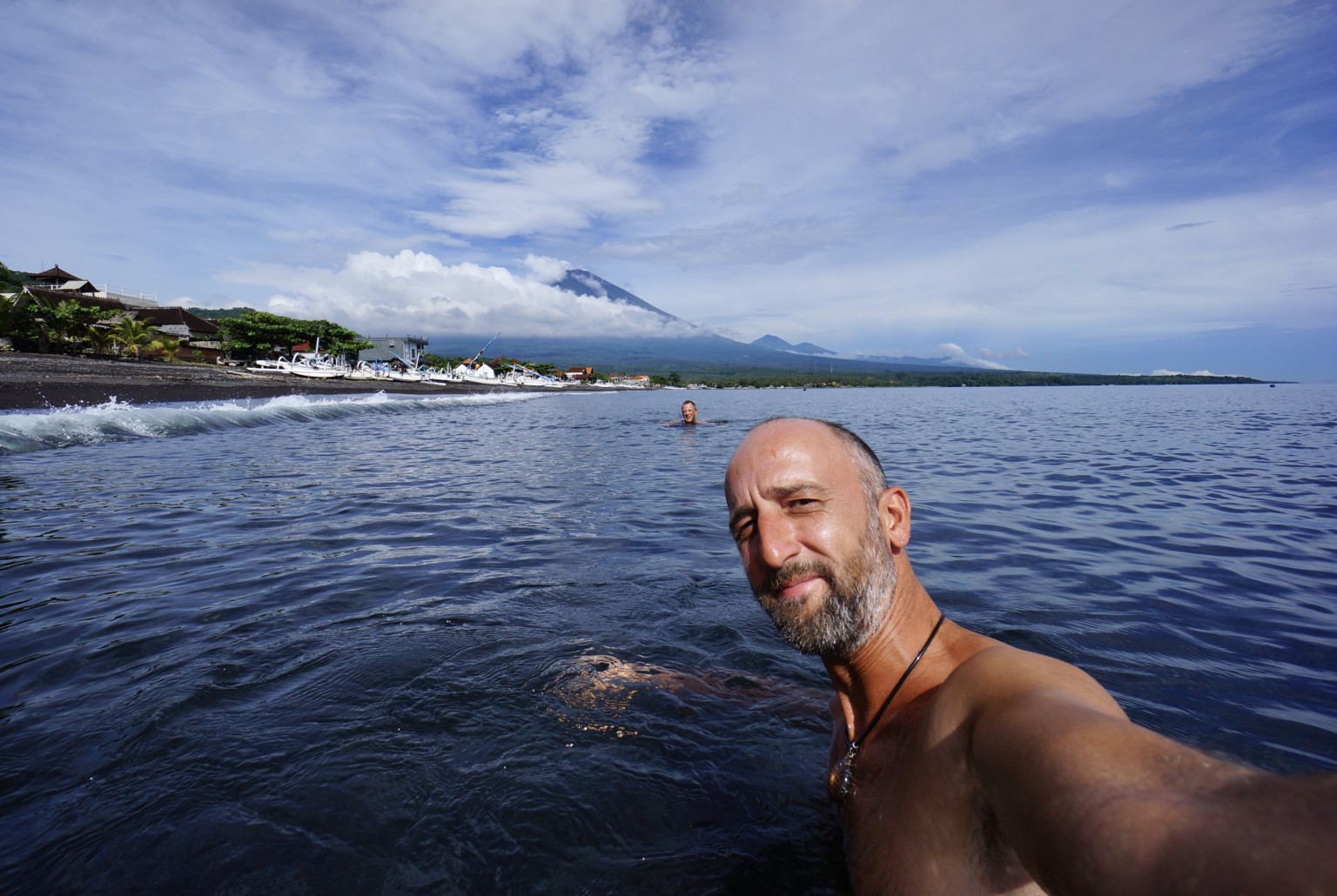 Nach einigen Tagen verlassen wir Ubud und fahren Richtung Nordwesten zu zwei Bergseen um den erloschenen Vulkan Bratan. Wie geahnt, geht es recht steil hinauf. Für uns sind das die knackigsten Anstiege auf unserer bisherigen Reise. Die Sonne und Luftfeuchtigkeit tut ihr Bestes um uns so richtig ins Schwitzen zu bringen. Als wir fast oben sind, fängt es auch noch ordentlich an zu regnen. Eigentlich wollten wir zelten, doch bei dem Wetter kann man das vergessen. Der Regen hat kurz aufgehört und wir erhaschen einen Blick auf einen Tempel, der am Seeufer steht. Dann hat Silvio auch noch eine Reifenpanne und es regnet wieder wie aus Eimern. Uns bleibt also nichts anderes übrig, als eine Unterkunft zu suchen und nach kurzer Suche auch zu finden. Am anderen Morgen zeigt sich wieder die Sonne und die Wolken haben sich verzogen. Wir haben eine fantastische Sicht auf die Seen und die Berge mit ihren bewaldeten Hängen. So könnte jeder Tag losgehen. Es steht uns eine lange Abfahrt zur Nordküste und später weiter in Richtung Osten bevor. Die Strände sind hier aus schwarzem Sand und sehr steinig. Die Vulkane lassen grüßen. Wir bleiben einen Tag in Amed, zum Schnorcheln. Vorher besorgen wir uns verschiedenes Obst, das haben wir bisher etwas vernachlässigt. So erstehen wir Drachenfrucht, Schlangenhautfrucht, Mangosteen, Zimtäpfel und weiße Mangos. Zu Hause ist das alles unerschwinglich, hier kostet es nur ein paar Cent, ist frisch und zudem noch saulecker. An die stinkenden Durianfrüchte trauen wir uns allerdings nicht ran. Leider ist das Wasser in Amed zum Schnorcheln zu trüb, doch wir können trotzdem viele Fische und Korallen sehen, inklusive eines alten japanischen Wracks.