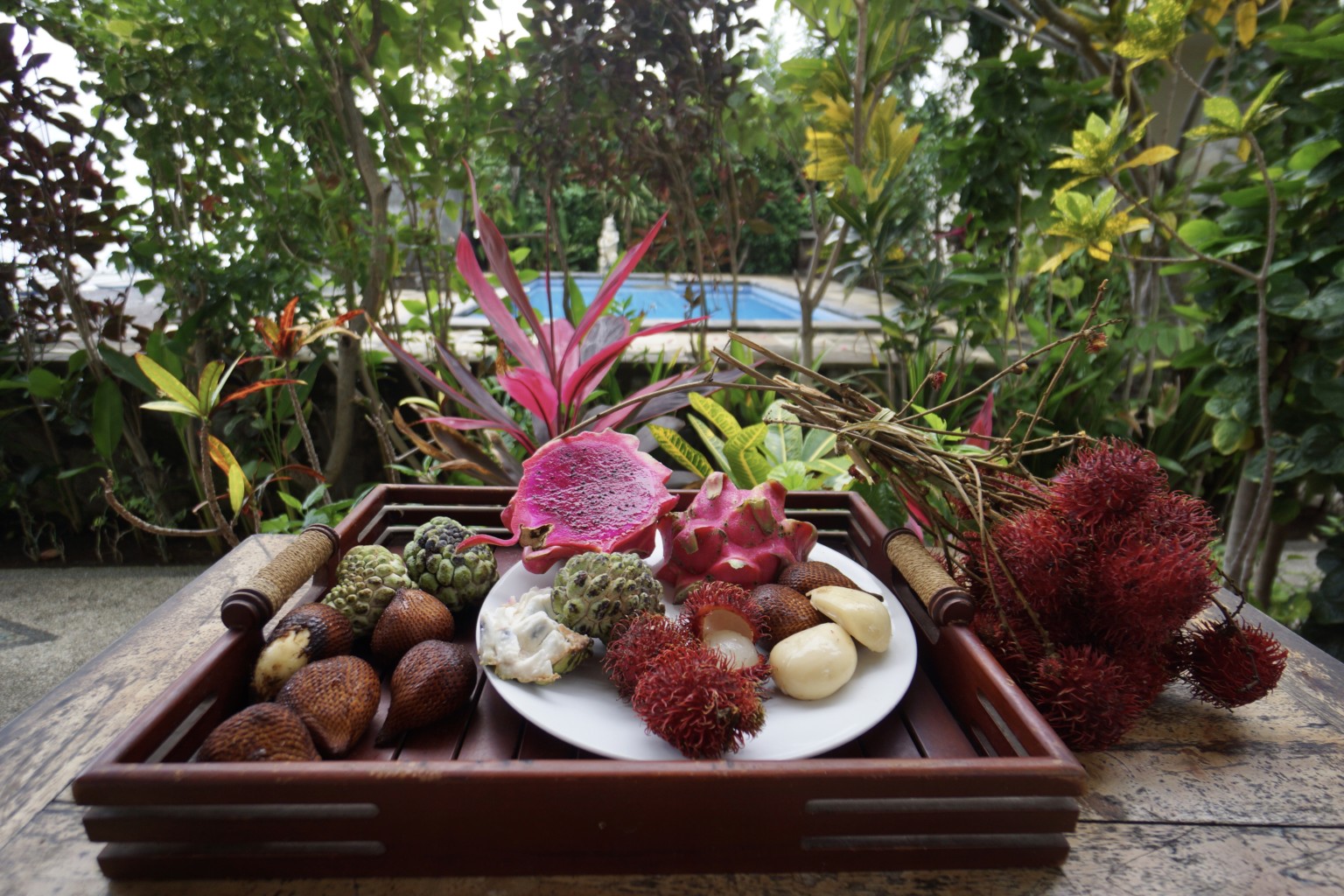 Unser nächstes Ziel ist Ubud. Bei einer tollen Bergabfahrt werden wir auf ein Schild aufmerksam. In einer kleinen Organic Farm wird der berühmte Luwak- Kaffee (Katzenkaffee) verkauft. Wir beschließen eine Führung durch den Garten mitzumachen. Uns wird allerlei Neues vermittelt, z.B. wie der Kaffee hergestellt wird, welche Früchte hier wachsen und die seltenen Katzen bekommen wir auch zu Gesicht. Da sie aber nachtaktiv sind, dösen sie nur in ihrem Käfig herum. Zum Abschluss wird uns ein Tablett mit verschiedenen Tees und Kaffees serviert und auch den teuersten Kaffee der Welt können wir probieren. Besonders gut schmeckt der Kaffee aber nicht und für drei Euro pro Tasse haben wir weitaus mehr erwartet. Nach der Kostprobe geht es für uns weiter nach Ubud. Schon die Einfahrt in diesen Ort, bestehend aus Boutiquen, Cafés, Souveniershops und Hotels, zeigt uns, dass der Massentourismus hier bereits längst angekommen ist. So beschließen wir rasch weiterzufahren und finden etwas außerhalb ein kleines ruhiges Homestay, in dem wir uns sofort pudelwohl fühlen. Um einen Pool mit vielen tropischen Pflanzen gruppieren sich die Zimmer. Es gibt den leckeren Bali- Kaffee, von dem wir trinken können, soviel wir wollen und das Frühstück ist im Preis inbegriffen. Das Haus wird von einer Familie betrieben, welche gut englisch spricht und sehr hilfsbereit ist. Wie übrigens alle auf Bali. Wir ruhen uns erst einmal aus, schließlich sind wir ja im Urlaub!