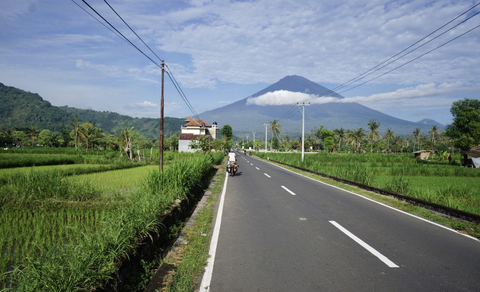 In Singapur gibt es einen nächtlichen Zwischenstopp für uns. Wir gönnen uns einen kleinen „kulinarischen Hochgenuss“ bei Burger King (hatten wir bis dato noch nie) und suchen uns anschließend eine kleine ruhige Nische für unser Nachtlager. Mit Oropax und Augenklappe gelingt uns der Schlaf (auch wenn recht kurz) ganz gut und dann bringt uns der Weiterflug zum ersten Mal auf die Südhalbkugel. Beim Landeanflug haben wir bereits einen ersten Blick auf die Vulkane der Insel und ahnen schon was uns radltechnisch erwarten wird. Das Gepäck und die Räder kommen in einwandfreiem Zustand an, wir bauen zusammen und verlassen recht zügig den Großraum von Denpasar. Was uns sofort auffällt, ist die saubere und klare Luft, wir können wieder richtig atmen. Auch die Straßen sind aalglatt und lassen die Räder nur so dahingleiten. Nach den vielen Staubpisten der vergangenen Wochen, haben wir fast schon vergessen, wie schön das Fahrrad fahren doch sein kann. Wir entfernen uns vom Trubel der Großstadt und nehmen Kurs auf den kleinen Küstenort Padang Bai. Über hügelige Straßen fahren wir durch herrlich grüne und dichtbewachsene Alleen, bis wir drei Stunden später die kleine Ortschaft erreichen. Hier finden wir am Ortsrand eine kleine Unterkunft in Familienhand zusammen mit 20 Katzen und 11 Hunden, die unser Gehen und Kommen jedes Mal mit einem lauten Hundegebell begleiten.