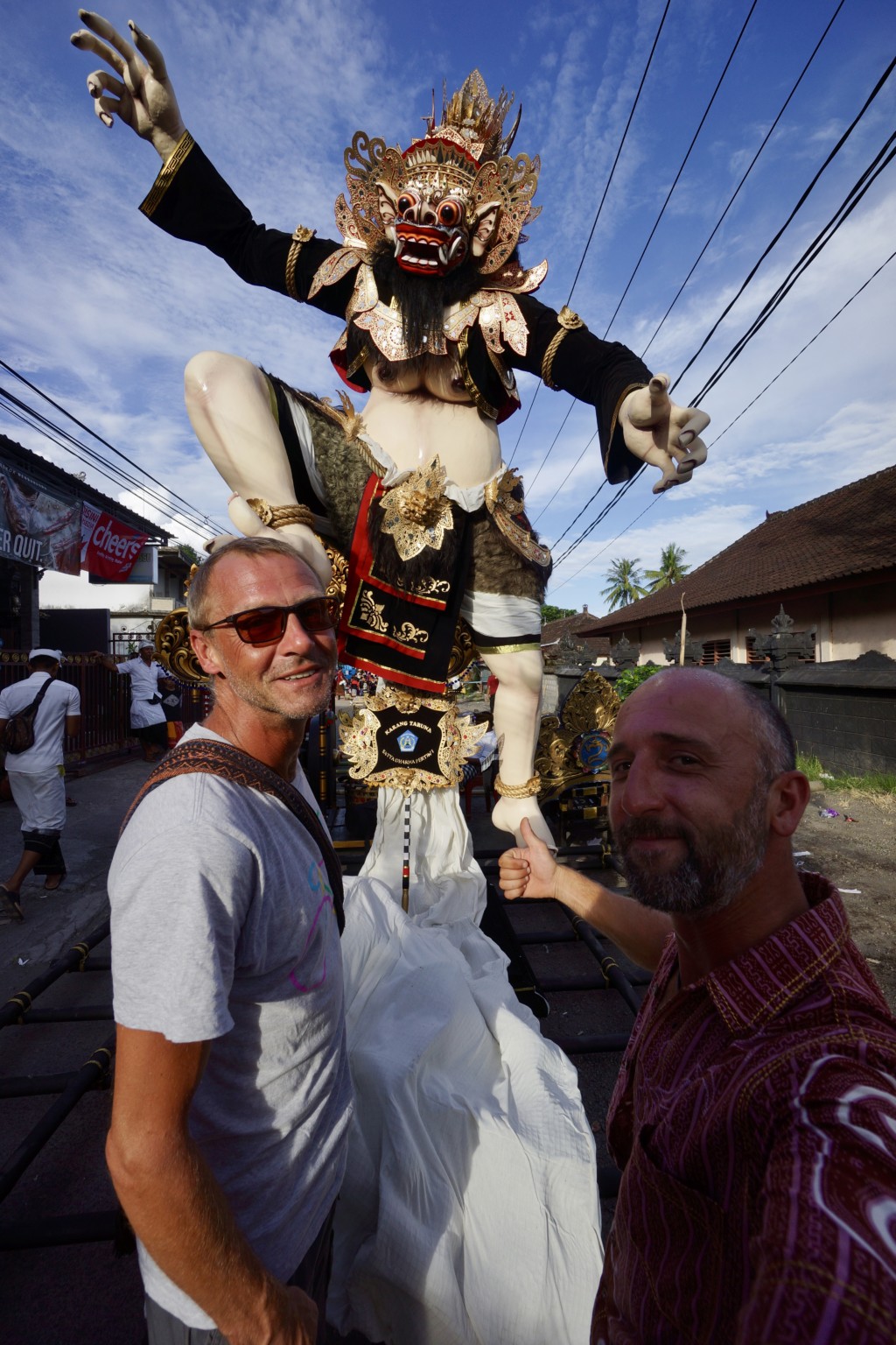 Dann wird es dunkel und der Umzug geht los. Jeder Ogho Ogho steht auf einem Bambusgestell und wird von einer Gruppe getragen, viele davon sind Kinder. Davor oder dahinter befindet sich eine kleine Musikkapelle, die die typischen balinesischen Instrumente mit sich führt und Musikstücke spielt. Das Schauspiel zieht sich eine Weile hin. Es ist bereits stockdunkel, als die letzten „Geister“ in einem Tempel ankommen, wo sie dann später feierlich verbrannt werden, alles Teil der Zeremonie. Am nächsten Morgen ist es tatsächlich still. Kein Moped und kein Auto fährt, auf den Straßen ist außer der Religionspolizei (die hat Dolche am Gürtel), niemand zu sehen, alle Gespräche werden gedämpft geführt und sogar die Hunde halten mal die Klappe. Alle Balinesen nehmen das Fest sehr ernst. Anfangs funktioniert das Internet noch, am Nachmittag wird es abgestellt. Aber Strom gibt es zum Glück (für die Klimaanlage) und unsere Gastgeber versorgen uns mit leckerem selbstgekochtem Curry. Da nachts kein Licht brennen darf, haben wir zudem einen fantastischen Sternenhimmel.