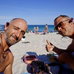 Nach ein paar Tagen des Nix-Tuns ziehen wir weiter und auf unserem Weg begegnen wir immer wieder aufgeschlossenen, humorvollen und gastfreundlichen Menschen. Es sind kurze aber nette Begegnungen, meist während unserer Pausen. Oft fragt man uns, woher wir kommen, wohin die Reise geht, man wünscht viel Glück oder lädt uns auf einen kleinen Aperitif ein. Auf der Suche nach einen Schlafplatz lernen wir Victor kennen, einen Angler und Grundstücksbesitzer mit großer Wiese und einem eigenen See. Als wir dort aufkreuzen, traut man seinen Augen kaum. Mitte aus dem Nix tauchen plötzlich zwei vollbepackte Radfahrer auf. Wir fragen, ob wir auf der Wiese campieren können und auf die Gegenfrage „Terrorist Tourist“ antworten wir natürlich mit „Tourist“. Wir bekommen den Platz und man lässt uns für eine kurze Zeit allein. Wenig später kommt Victor mit Kartoffeln und zwei großen fangfrischen Karpfen wieder. Er nimmt die Fische auseinander, währenddessen wir das Feuerholz schlagen und wenig später landet alles auf dem Grill. Ein spontan geniales Abendessen und eine ausgesprochene Gastfreundlichkeit die Victor an den Tag legt.
